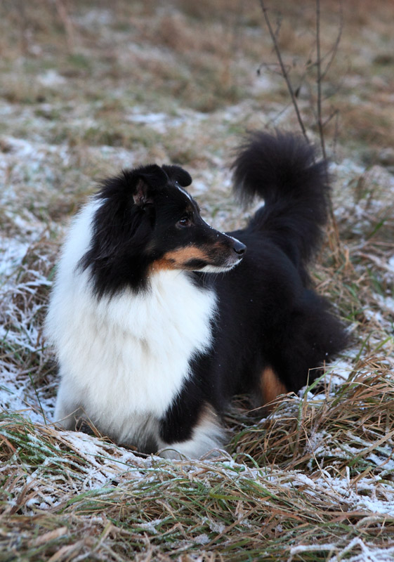 Kauan odotettu Jyväskylä KV! :) Meidän aamu alko puoli kuuden maissa, ja seittemän jälkeen lähdettiin ajelemaan Jyväskylää kohti Elli seurana. Ei oltu päästy kun matkan puoleenväliin, kun sain ensimmäisen paniikinaiheen: numerolappu jäi kotiin! Onneksi sain näyttelypaikalta uuden, ja matkat sun muu suju muutenkin täysin ongelmitta. Shelttejä oli ilmotettu 55, joista 34:stä nartusta 16 oli avoimessa. Sheltit tuomaroi saksalainen Heiko Wagner. En oo ollenkaan varma Laran juoksuista, joten pidin sen suosiolla vähän kauempana kehästä. Urokset ei kuitenkaan ollu kiinnostunu siitä tavallista enemmän, eikä se mitään tiputellu - mitä ny kuolas hirveesti... Ja turkki on aika kauhees kunnos; vaikka kyllähän se kauheesti kiiltää, se vähä mitä sitä on. Odotteluajan Lara vaan iskuskeli ja makoili meidän jaloissa kun seurattiin kehää, ja kyllästyny haukkuminenkin alko vasta, kun turkin puunaamisen jälkeen piti vielä odotella hetki, ennen kuin päästiin kehään. Tosi kivasti siis käyttäyty kaikenkaikkiaan.