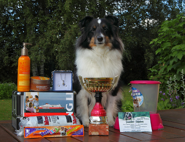 Mätsärien loputtua meidän oli odotettava junaa puolitoista tuntia, mutta aika nopeesti se meni. Larakin onneksi nukahti penkin alle, kun oli ensin vähän haukkunu parille vastaantulijalle, ja kotimatkan se oli sen verran väsyny, että maltto olla hiljaa. Kaikenkaikkiaan oon tosi tyytyväinen Laran esiintymiseen. Muutenkin oli hauskaa, mätsärit oli hyvin järjestetty ja hyvät palkinnot, niinkun kuvasta näkyy. Kiitokset seurasta ja kyydityksistä Marille ja Astalle! :)