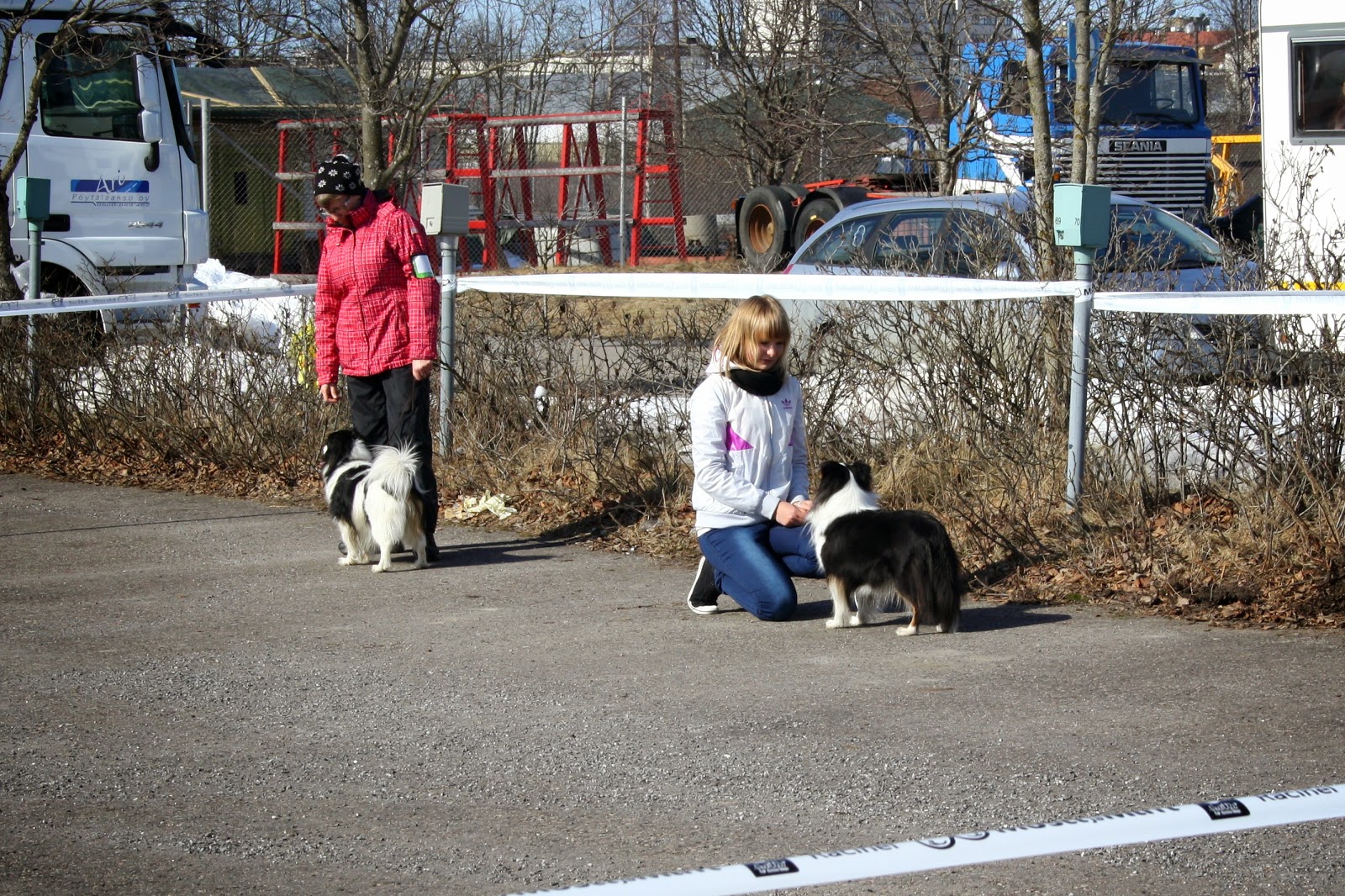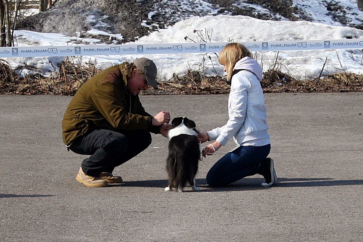 Tuomari jakoi sinisiä ja punaisia nauhoja vähän fiiliksen mukaan, ja loppujenlopuksi sinisen saaneita oli kuusi ja punaisen saaneita ainakin puolet enemmän. Seri esiintyi tosi siististi ja sijoittui sinisten kolmanneksi, ja sitten punaiset kutsuttiin kehään. Koiria vain seisotettiin kehässä ja tuomari kävi katsomassa jokaista pikaisesti. Lara keskittyi hyvin, mutta meidät käteltiin ensimmäisinä kehästä pois. Loppujenlopuksi Oliver voitti punaiset, onnea vielä! ^^