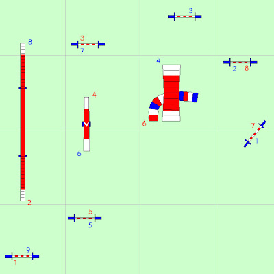 Suunnittelin meille etukäteen tollasen radan, mutta esteet vähän tiiviimmin kuin kuvassa. Siihen tulikin aika tiukkoja käännöksiä ja lyhyitä estevälejä, kun kenttä oli vähän kapeempi kun mitä muistelin... En halunnut mitään liian haastavaa, kun koirien tasokin on aika vaihteleva, mutta kyllä tossa ajateltavaa sai. Mentiin ensin punasta rataa, ja halusin siihen paljon valsseja ja kiertoja, sekä takaaleikkauksen seiska-aidalla.