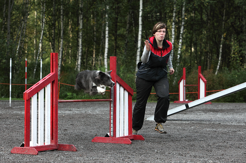 Sain Laran ihan hyvään vireeseen, kun se odotteli rataantutustumisen ajan aidassa kiinni, ja omaa vuoroa odotellessa tokoiltiin ja teetin sillä kaikenlaisia pieniä temppuja. Kun meidän vuoro sitten tuli, laitoin koiran istumaan ja menin ite kakkoshypyn taakse. Koira nousi kutienkin ennen kuin sai lupaa ja käveli rennosti ensimmäisen hypyn taakse kuitenkaan hyppäämättä estettä, ja kun menin laittamaan sitä takaisin, tuomari huikkas vaan että ajanotto käynnistyi jo ja teidät