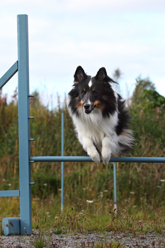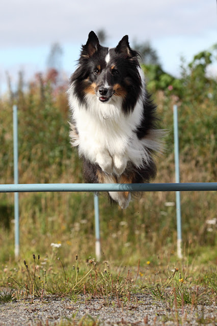 Toistoja sai tietysti ottaa aika paljon onnistuneiden kuvien saamiseksi, ja rakentelin loppuun tollasen mukavan pienen radan. Ohjasin aluksi niin, että valssasin kolmoshypyn jälkeen, jatkettiin neloshypylle suoraan ja valssasin taas ennen keinua. Lara oli tajuttoman nopea ja kuunteli hyvin, mutta vitoshyppy tökki, kun en yksinkertasesti ehtinyt putken päähän ennen koiraa. Tehtiin rata pari kertaa, kunnes tajusin vaihtaa ohjausta niin, että pysyin kolmoshypyn jälkeen vasemmalla puolella kuten videossa. Tossakaan ei tosin oo mitään järkeä kun nyt kattoo, jälkeenpäin aateltuna vitoshypyllä ois kannattanu tehä takaaleikkaus eikä tehdä tollasta turhaa silmukkaa... Tossa vaiheessa vauhti oli vähän hiipunu, mutta kyllähän se alko tossa putken jälkeen pinkomaan vähän ripeemmin. Puomin viiminen alastulokontaktikin on ihan kuraa kun kiirehdin ite enkä oottanut koiraa, mutta korjattiin se jälkeenpäin.