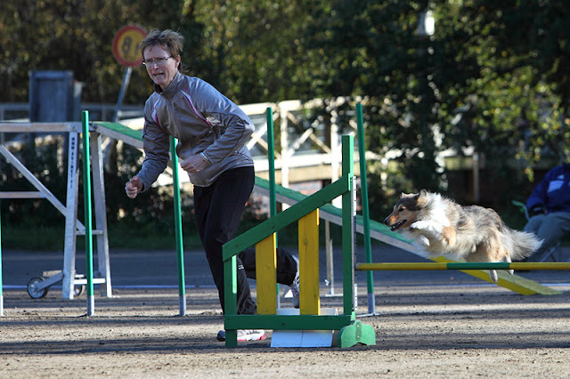 Lähdössä Lara meinas lähteä pillistä mutta pysyi kuitenkin, ja jo heti puomille mentäessä olin sen verran sekasin että huusin putkeenputkeenputkeen ja koira vaan näytti vähän hämmentyneeltä, mutta puomi meni tosi vikkelästi ja kontaktit myös. Putkeen se irtos tosi hyvin niin, ettei mun tarvinnut ite ohittaa vitosestettä ollenkaan.Kepit lähti vähän hitaasti, ja huomasin näyttäväni välejä jonkun verran.. Keppien jälkeen vauhtia tuli kuitenkin ihan räjähtysmäisesti, ja meno oli tosi lupaavaa 13-hypylle asti, kun valssasin putken jälkeen ehkä hiukan myöhässä ja koira ampaisikin kasiaidalle. Loppurata oli ihan loistava! Keinulle mentäessä koira oli vähän liiankin innokas, jäin hieman jälkeen eikä se tainnut erottaa keinua puomista, vaan juoksi ihan keinun päähän asti ja teki komean lentokeinun. En oisi arvannut siltä tollasta!
