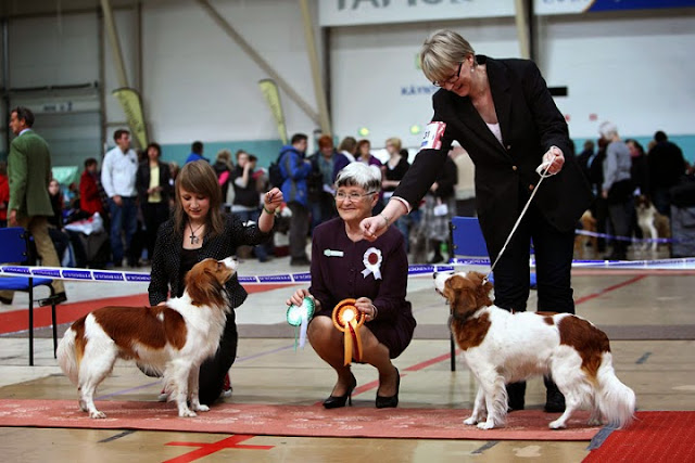 Shelttejä oli 84, joista narttuja 49 ja avoimessa luokassa 19. Sheltit tuomaroi irlantilainen Margaret Martin, joka oli mun mielestä aika eleetön, käsitteli koiria nätisti ja arvosteli perusteellisesti ja ennen kaikkea hitaasti, mutta toisaalta arvostelut olivat pitkiä. Jakoi tosi paljon EH:ta, mutta ei ollut tiukka todellakaan, mä en ainakaan nähnyt yhtään sitä huonompia arvosanoja. Narttujen arvostelu taisi olla aika paljon myöhässä, ja alettiin Laran kanssa molemmat kyllästyä odotteluun. Siinä sen turkkia laittaessani huomasin myös, että se oli ehkä rumemmassa kunnossa kuin ikinä ennen. Okei, mä sanon tätä varmaan usein, mutta se näytti tosiaan järkyttävältä: ne harvat karvanhaituvat, joista joillain yksilöillä muodostuu niin sanottu