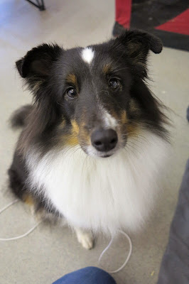 Shelttikehä oli samassa paikassa kuin tammikuussa, ja leiriydyttiin vetoisalle ja tyhjälle seinälle roskisten ja ulko-oven kanssa, juuri samaan paikkaan kuin viimeksikin. Unohdin vesikupin kämpille, joten ostin Laralle uudet, kumipohjaiset metallikupit, ja kierrettiin kaikki kojut ja hallit aika pikaisesti. Kun palattiin meidän leiriin, soitin jh-Sinille, joka tuli luoksemme ja harjoitteli Laran kanssa hetken. Se meni hyvin, mutta Sini olikin ottanut oman koiransa mukaansa, kun kehät menivät niin päällekkäin, eikä siis esittänytkään Laraa. Tuntui sitten vähän turhalta että oltiin menty sinne jo niin aikaisin. Lara rauhottu viltilleen tosi hyvin, joten kävin ostamassa pussillisen metrilakua ja oli ihan mukavaa vaan istua siinä sen kanssa ja seurata hallin vilinää. Seinälle tuli onneksi muitakin venäjänvinttikoirien ja bordercollieiden kanssa, joten ei ihan yksin tarvinnut odotella. Välillä toki harjoteltiin ja tokoiltiin ja käytiin kattomassa sekä sheltti- että staffikehää, mutta pääasiassa vaan istuskeltiin.